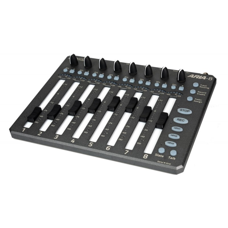 Aria is a mixing panel for the Nova and Nomad recorder/mixers and the first of it’s kind. There are two different versions, the Aria-8 and Aria-4. The Aria-8 works on it’s own as a standalone 8-fader panel, or you can expand it to either 12 or 16 faders on the fly by the addition of one or two Aria-4 mixing panels.